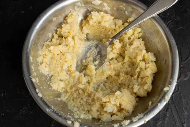 Добавляем манную крупу, сливочное масло, творог и яйцо. Все хорошо перемешиваем, даем смеси остыть и солим по вкусу.